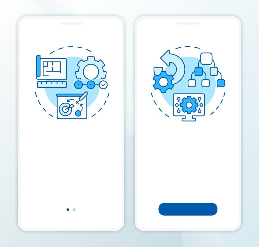 Forward vs reverse engineering blue onboarding mobile app screen. Walkthrough 2 steps editable graphic instructions with linear concepts. UI, UX, GUI template Pro Vector