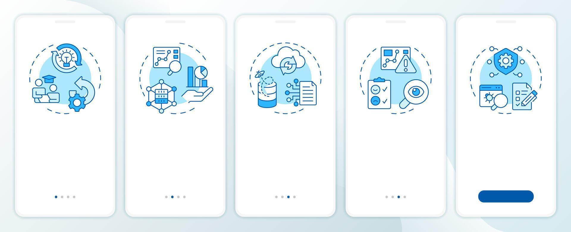 Re-engineering applications blue onboarding mobile app screen. Walkthrough 5 steps editable graphic instructions with linear concepts. UI, UX, GUI template Pro Vector
