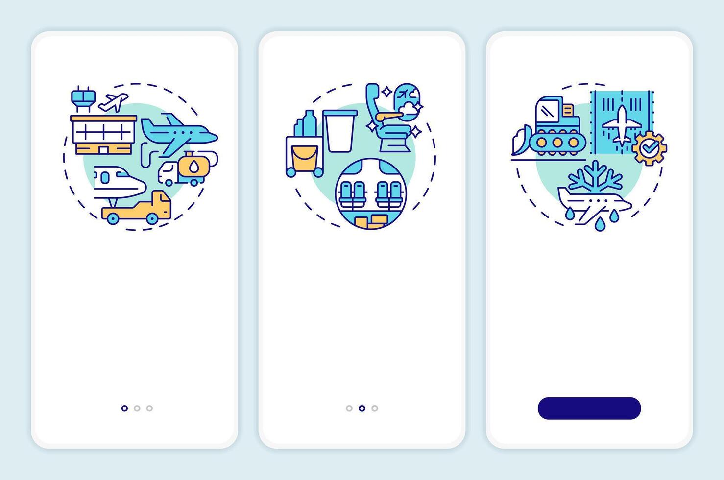Aircraft ground handling onboarding mobile app screen. Walkthrough 3 steps editable graphic instructions with linear concepts. UI, UX, GUI template Pro Vector