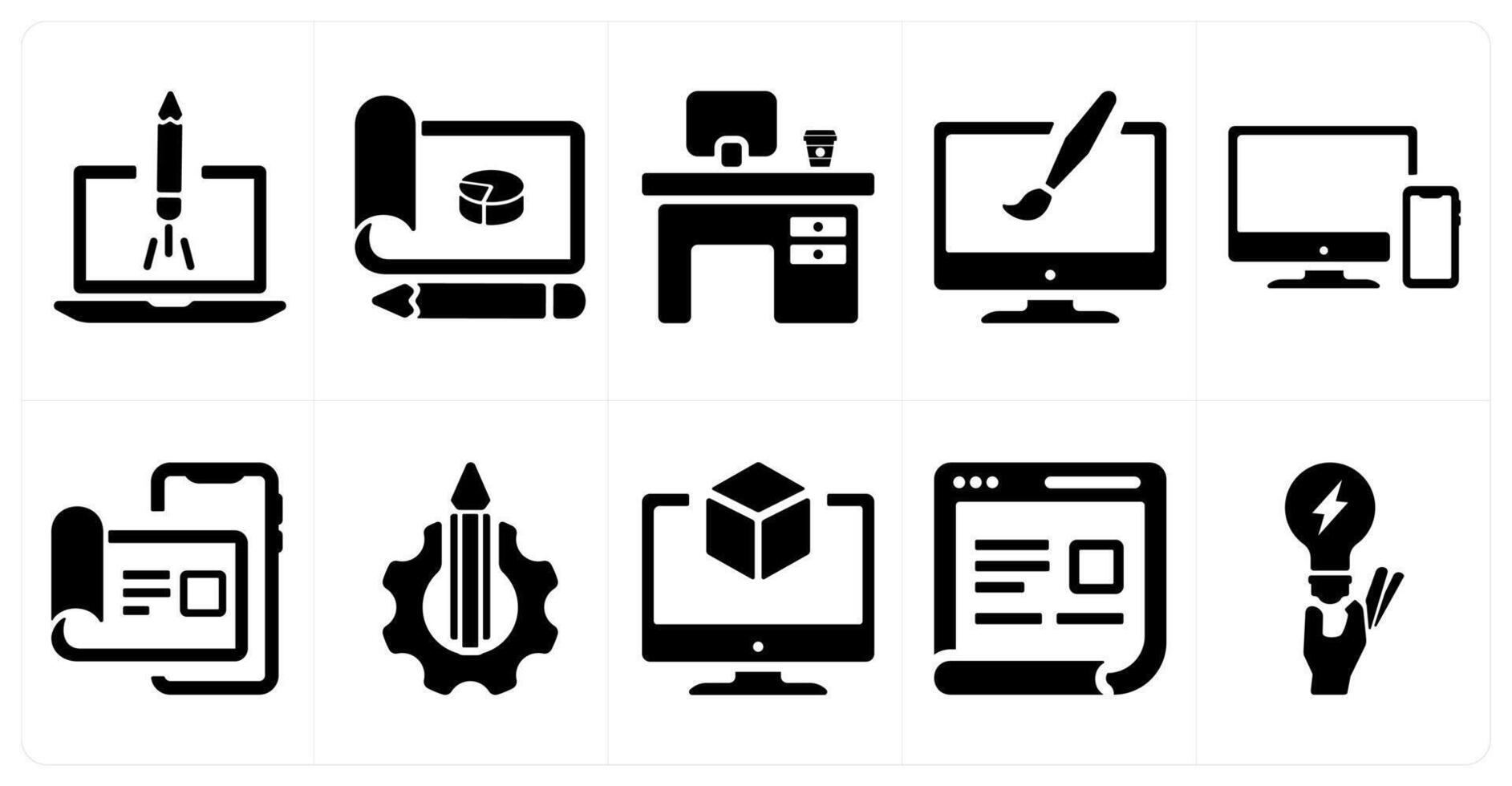 A set of 10 design and creativity icons as website launch, design, office desc, custom design Pro Vector
