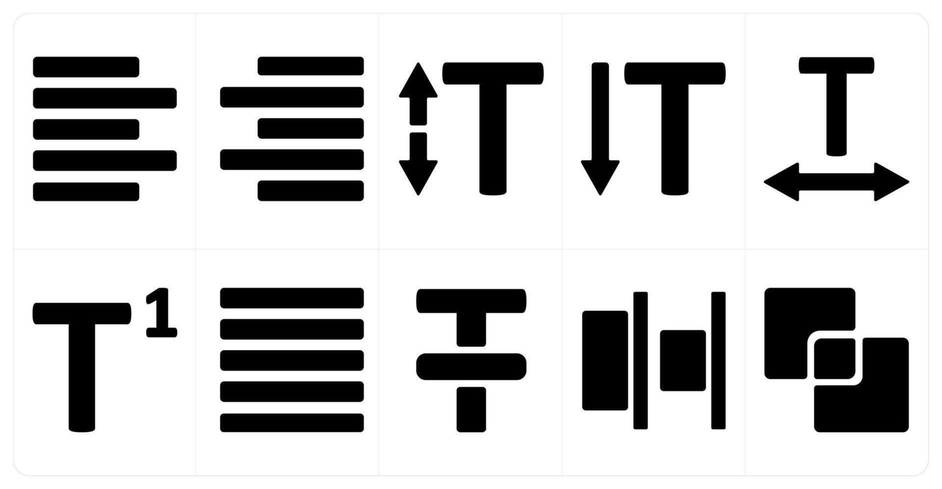 A set of 10 editing tools icons as text align left, text align right, text size Pro Vector