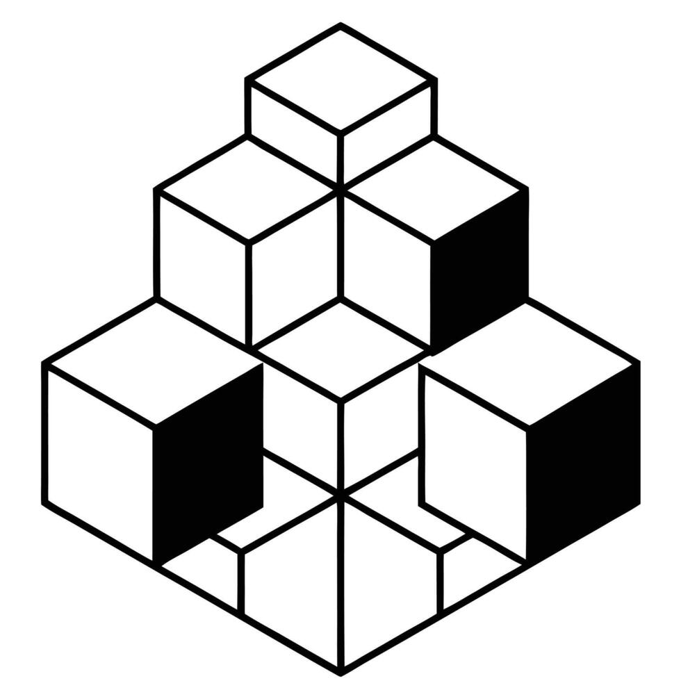 A black and white image of a 3D geometric structure made of stacked and overlapping cubes, creating a complex and intriguing pattern. Pro Vector