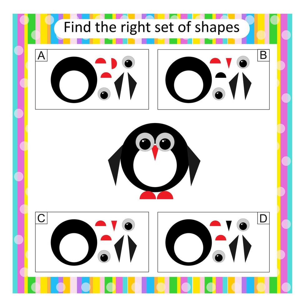 Logic puzzle for children. Find the correct set of cartoon penguin. Answer is C. Pro Vector