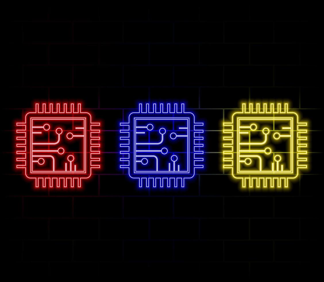 Glowing neon line Computer processor with microcircuits CPU icon isolated on black background. Chip or cpu with circuit board. Micro processor. .yellow Pro Vector