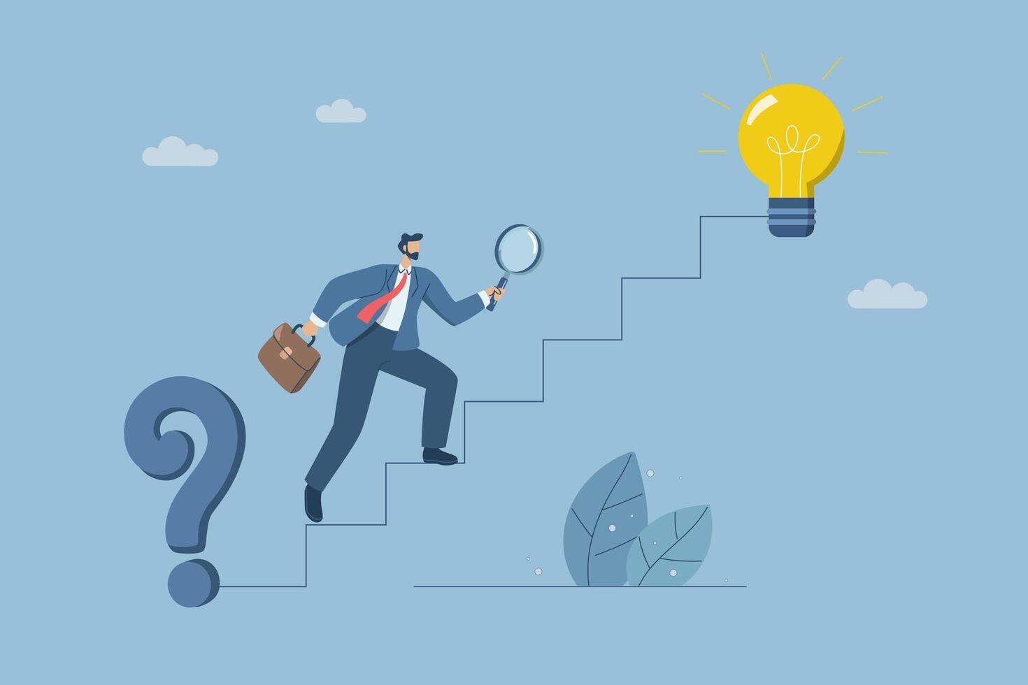 Businessman holding magnifying glass searching for solution to problem of stairs between question mark and light bulb, Finding the right direction or solution to a problem, Creativity to success. Pro Vector