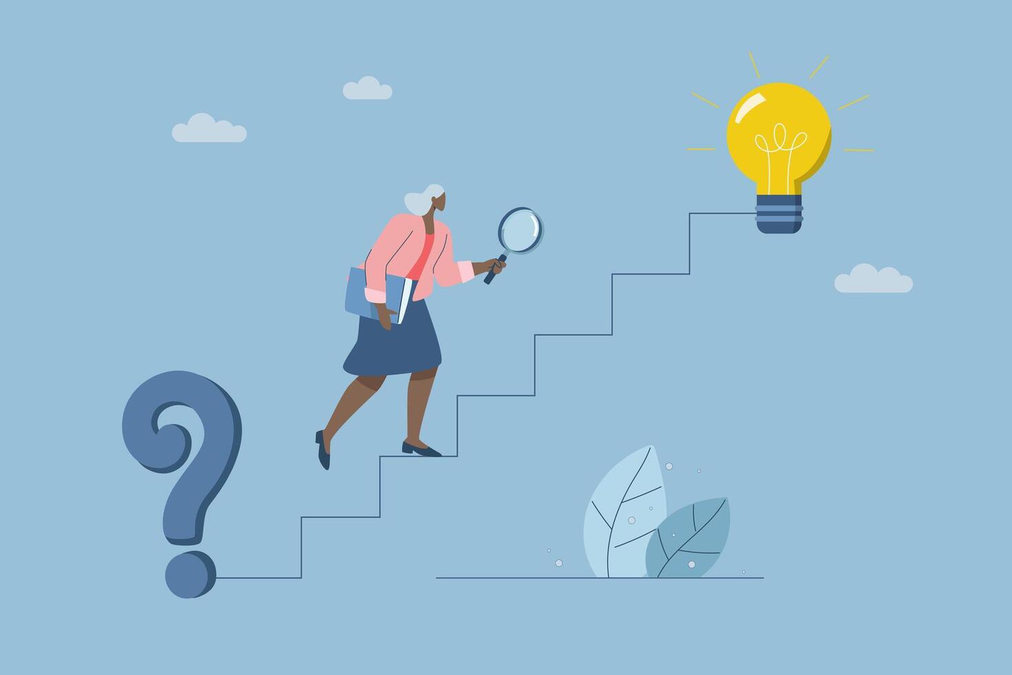 Businesswoman holding magnifying glass searching for solution to problem of stairs between question mark and light bulb, Finding the right direction or solution to a problem, Creativity to success. Pro Vector