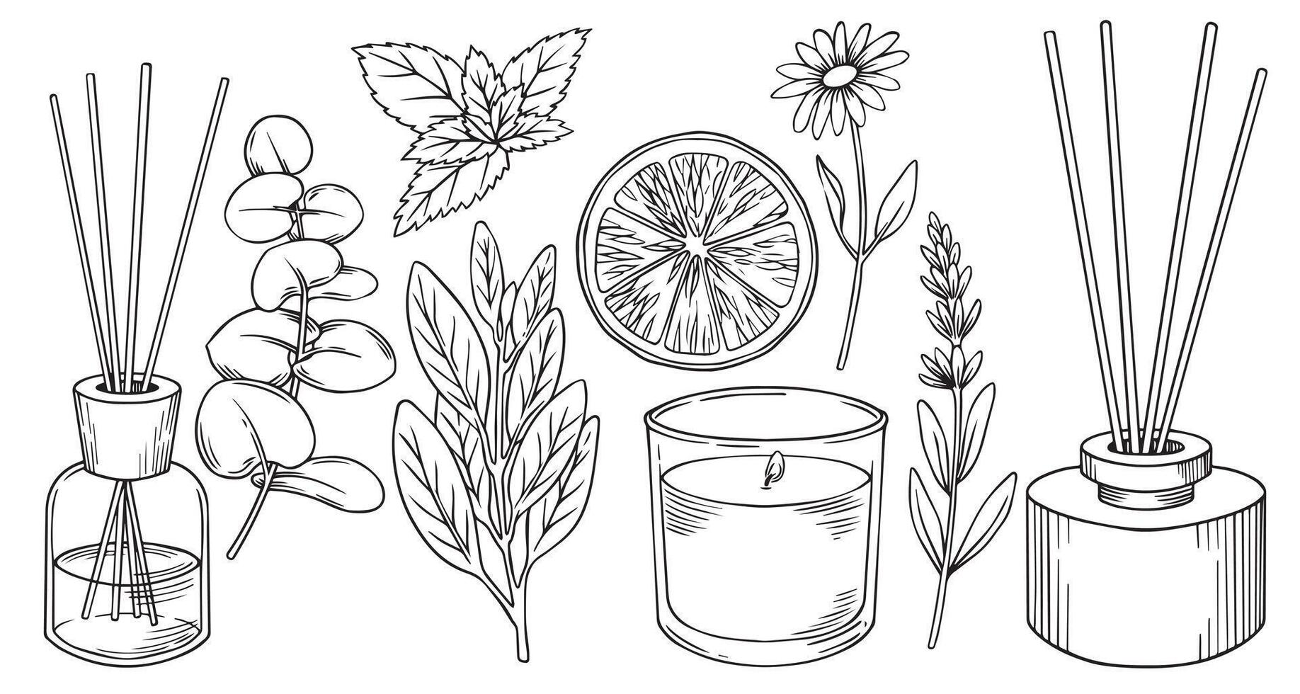 set of aroma diffusers with sticks and candles. illustration in sketch style. Pro Vector