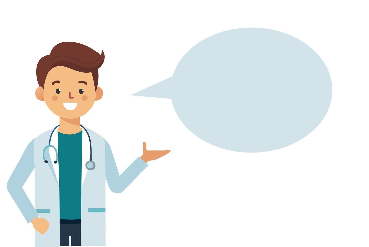 A friendly doctor in a lab coat gestures while discussing health tips, set in a bright and welcoming clinic environment during the day Pro Vector