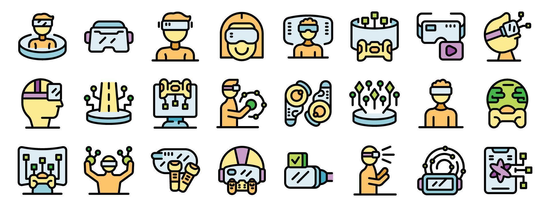 People experiencing virtual reality using vr headsets and controllers, exploring immersive digital worlds Pro Vector