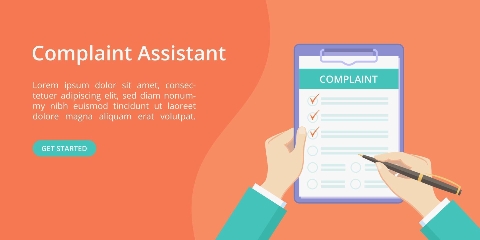 Complaint form on clipboard with hands landing page concept. Online assistant service website page concept, check list with complaint survey. Red landing illustration with hand and clipboard Pro Vector