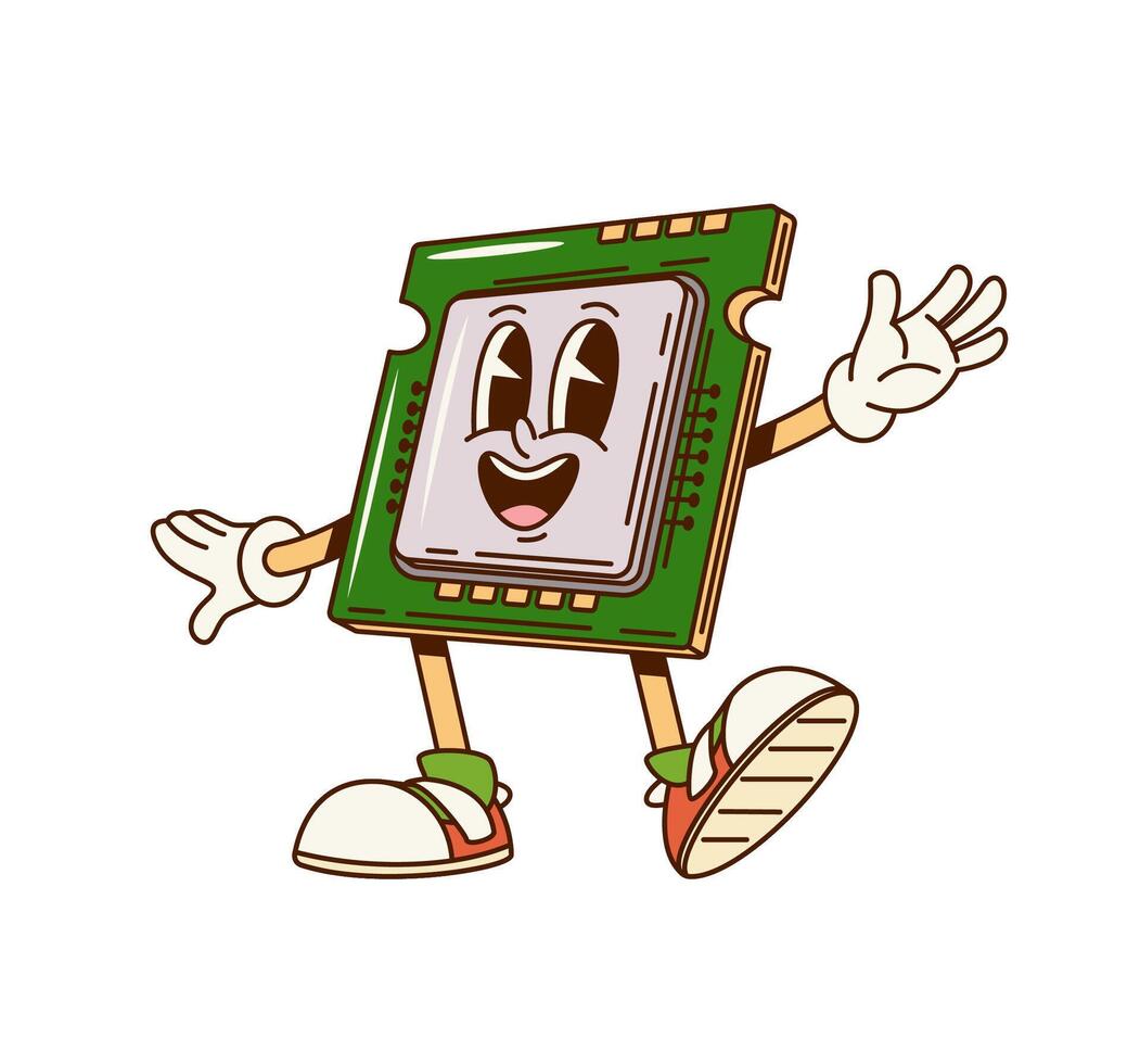 Groovy computer chip character with funny face Pro Vector