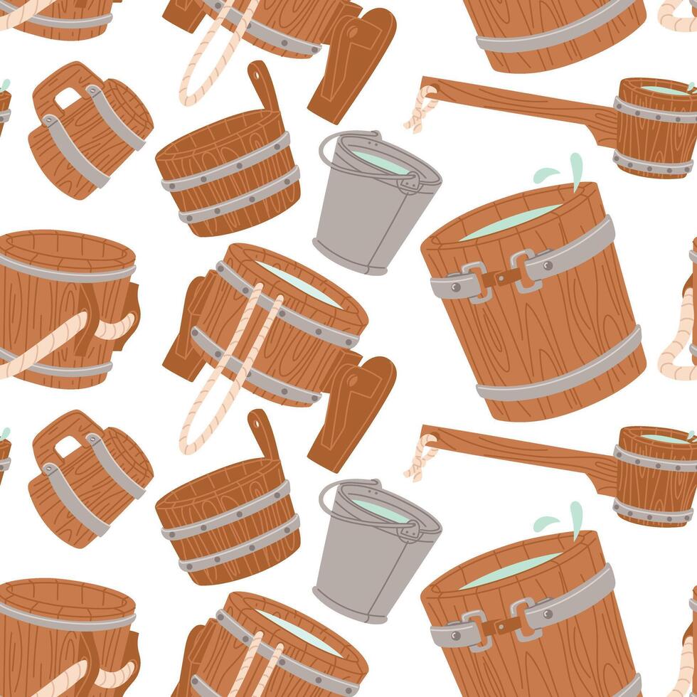 pattern of wooden buckets, buckets, barrels with and without water. container with running water, an empty bucket for spa, sauna. An iron bucket, wooden buckets with a rope. Texture of water bottles Pro Vector