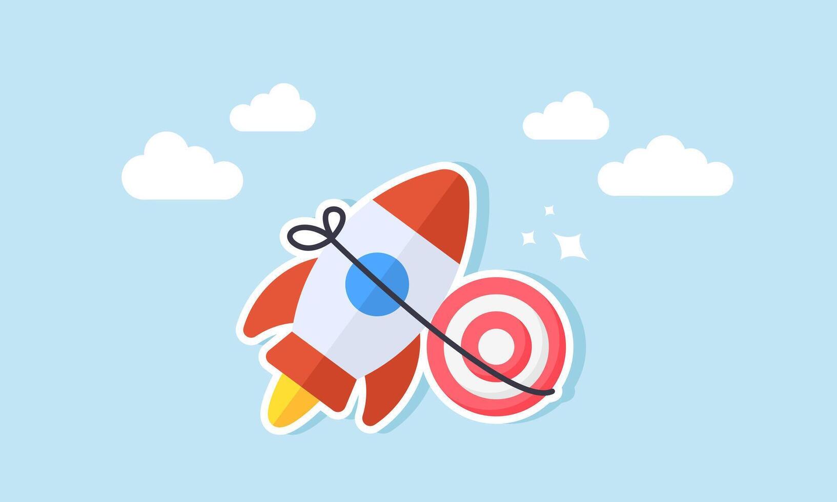 A target board tied with a rope to a rocket soaring into the sky, illustration of boosting business performance in achieving targets Pro Vector