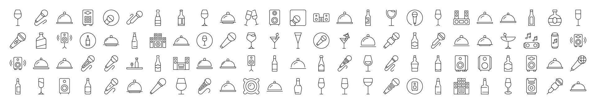 Cocktail, Bowl with Cloche, Bottle, Loud Speaker Simple Illustrations Drawn with Thin Line. Collection of Various Design Elements that Can Be Used for Apps, Articles, Web Sites, Social Media Pro Vector