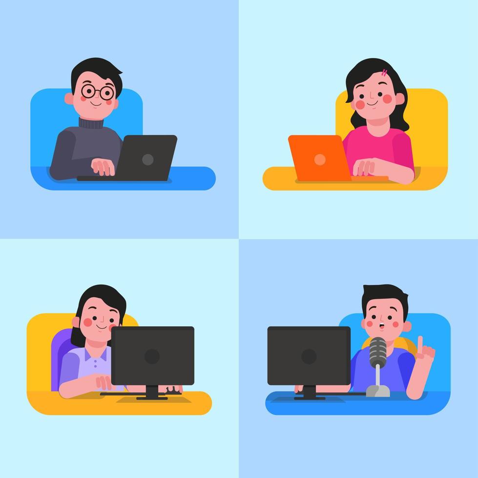 illustration of a freelancer in front of a computer while working in various jobs, some use a laptop as well as a computer Pro Vector
