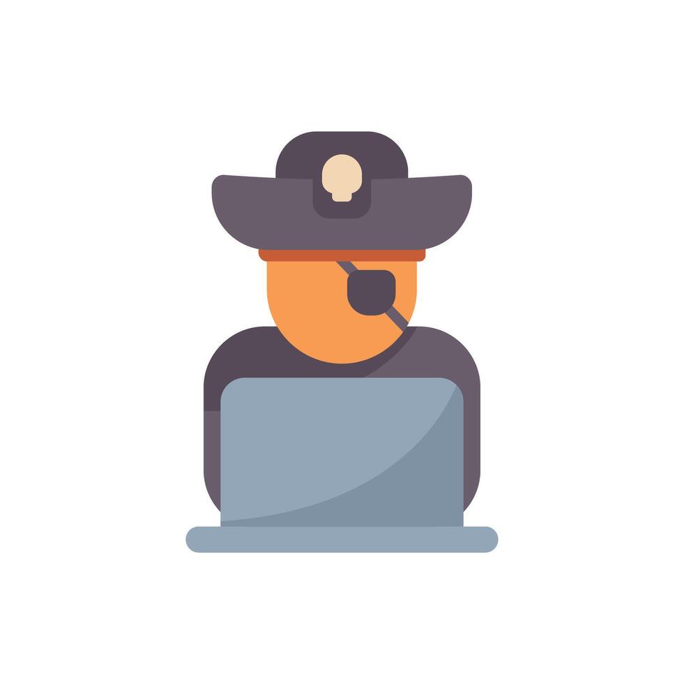 Hacker with eyepatch working on laptop using software for cybercrime Pro Vector