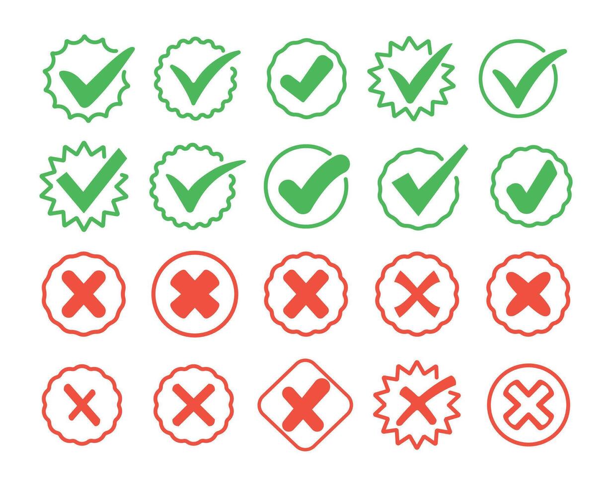 Set of red cross and green checkmark. Wrong and right. Collection trendy icons. Symbol sign. Hand drawn. Doodle. . Textbox and checkbox. Frame vote. Button. No and Yes. Flat line style. Tick Pro Vector