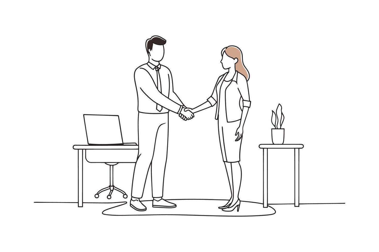 Man and woman shaking hands in front of a desk, symbolizing collaboration and agreement isolated continuous line art flat illustration on white background. vector
