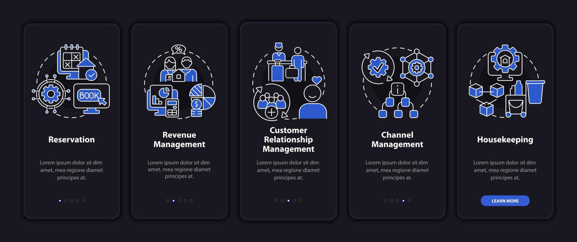 Modules of management night mode onboarding mobile app screen. Property walkthrough 5 steps graphic instructions pages with linear concepts. UI, UX, GUI template. Myriad Pro-Bold, Regular fonts used Pro Vector