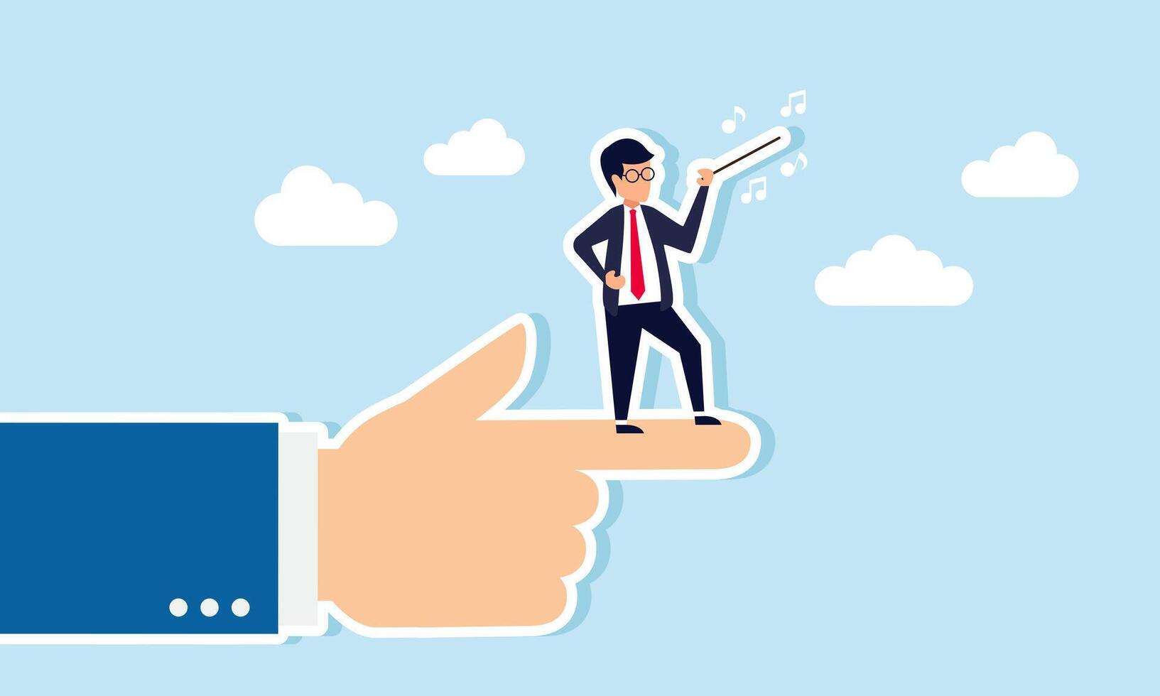 A hand pointing with a businessman holding a stick and a tuning fork at the fingertip, illustration of showcasing performance and art in leadership and management Pro Vector