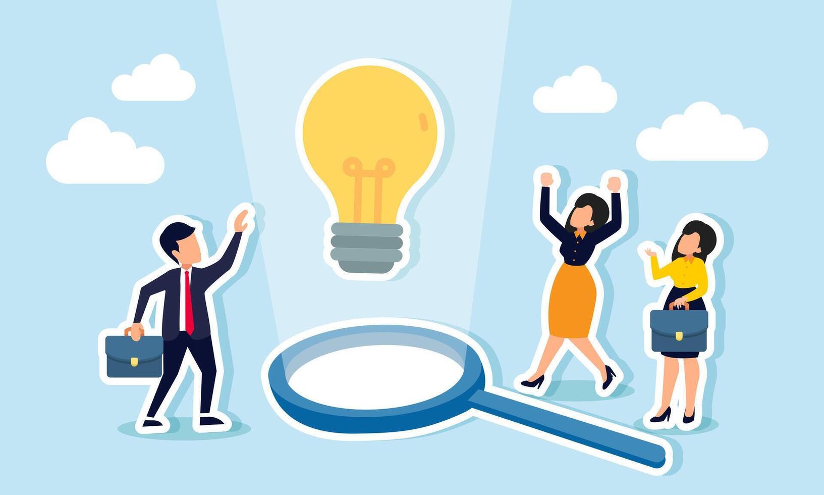 Businesspeople celebrating a lightbulb highlighted by light from a magnifying glass, illustration of results from the analysis of successful innovation and idea implementation for business growth Pro Vector