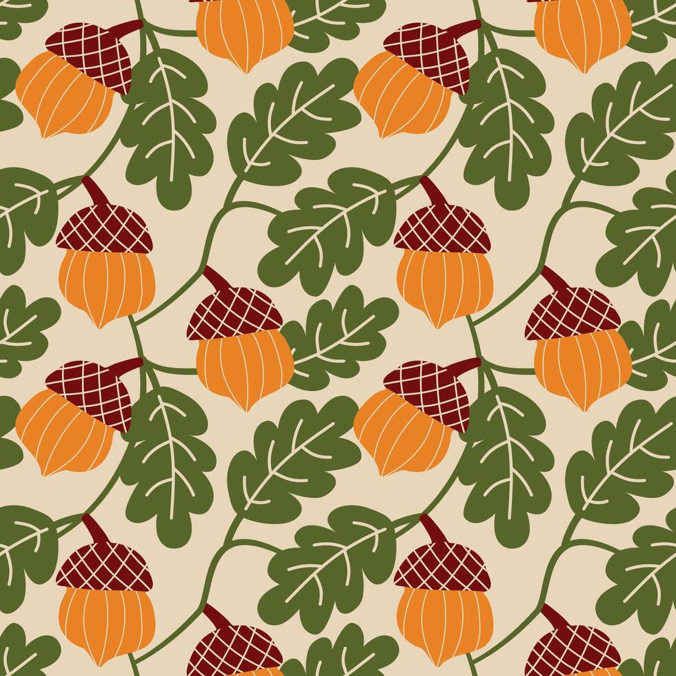 Seamless pattern with acorn, oak branch and leaf. Autumn acorns pattern. Pro Vector