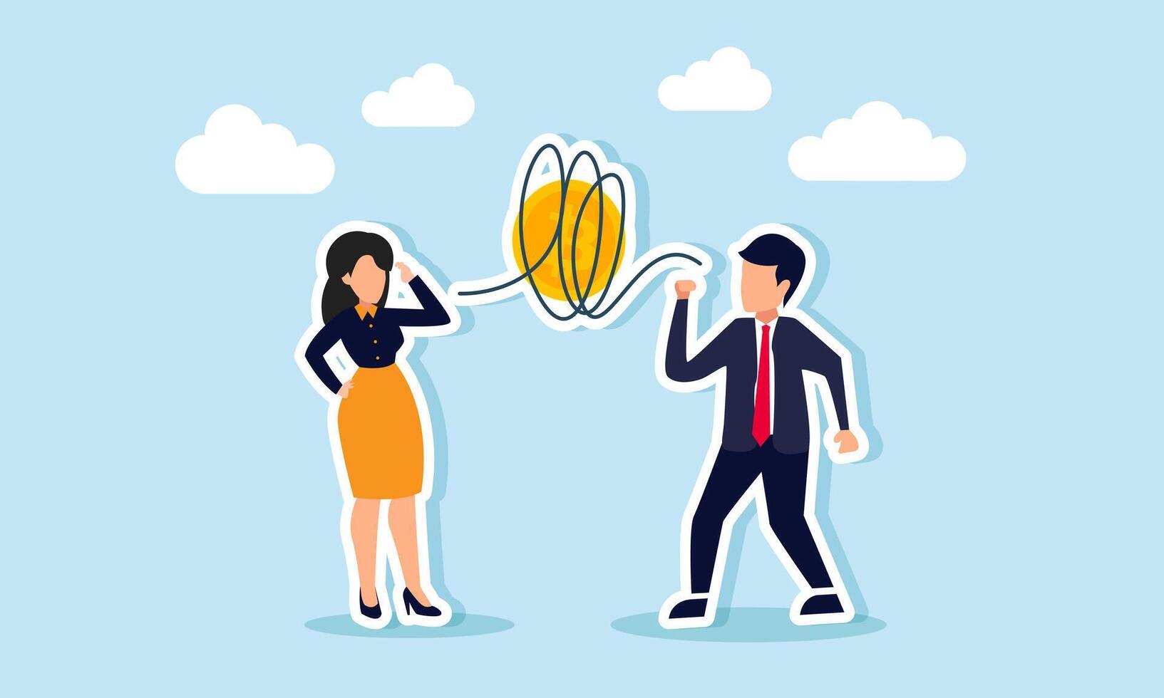 A businessman talks to a businesswoman through a complex web of ropes surrounding Bitcoin, illustrating the challenges in sharing information about Bitcoin. Pro Vector