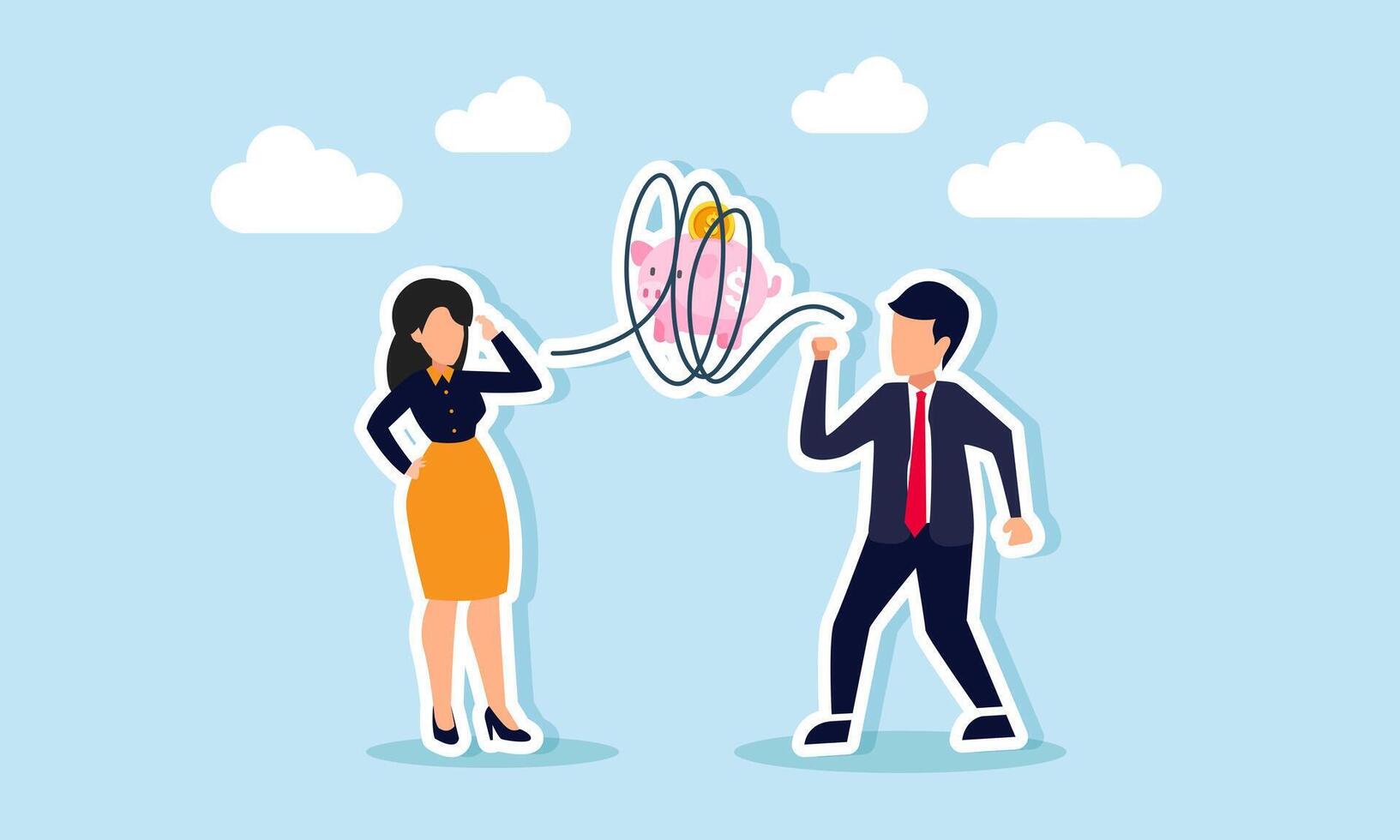 A businessman talks to a businesswoman through a complex web of ropes surrounding a piggy bank, illustrating the difficulty in sharing investment methods Pro Vector