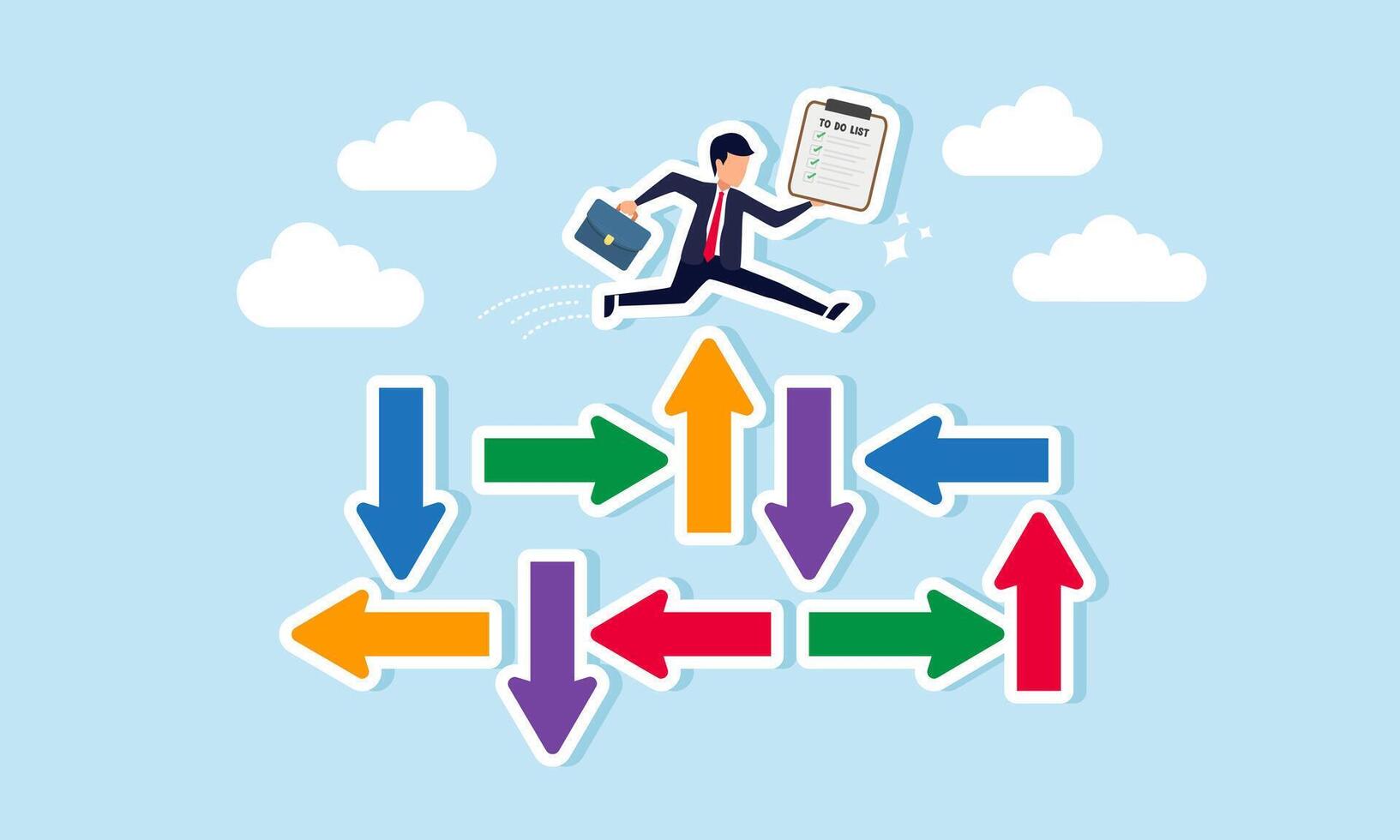A businessman jumps over a cluster of irregular arrows while holding a to-do list, illustration of focusing on completing tasks without being affected by uncertain financial policies Pro Vector