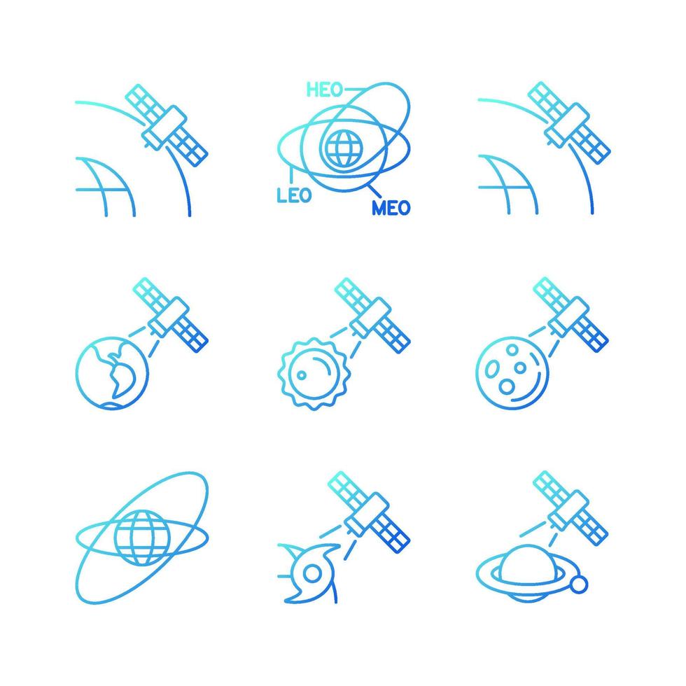 Satellites functions gradient linear vector icons set. Global telecommunications network connection, signal. Thin line contour symbols bundle. Isolated outline illustrations collection Pro Vector and Pro SVG