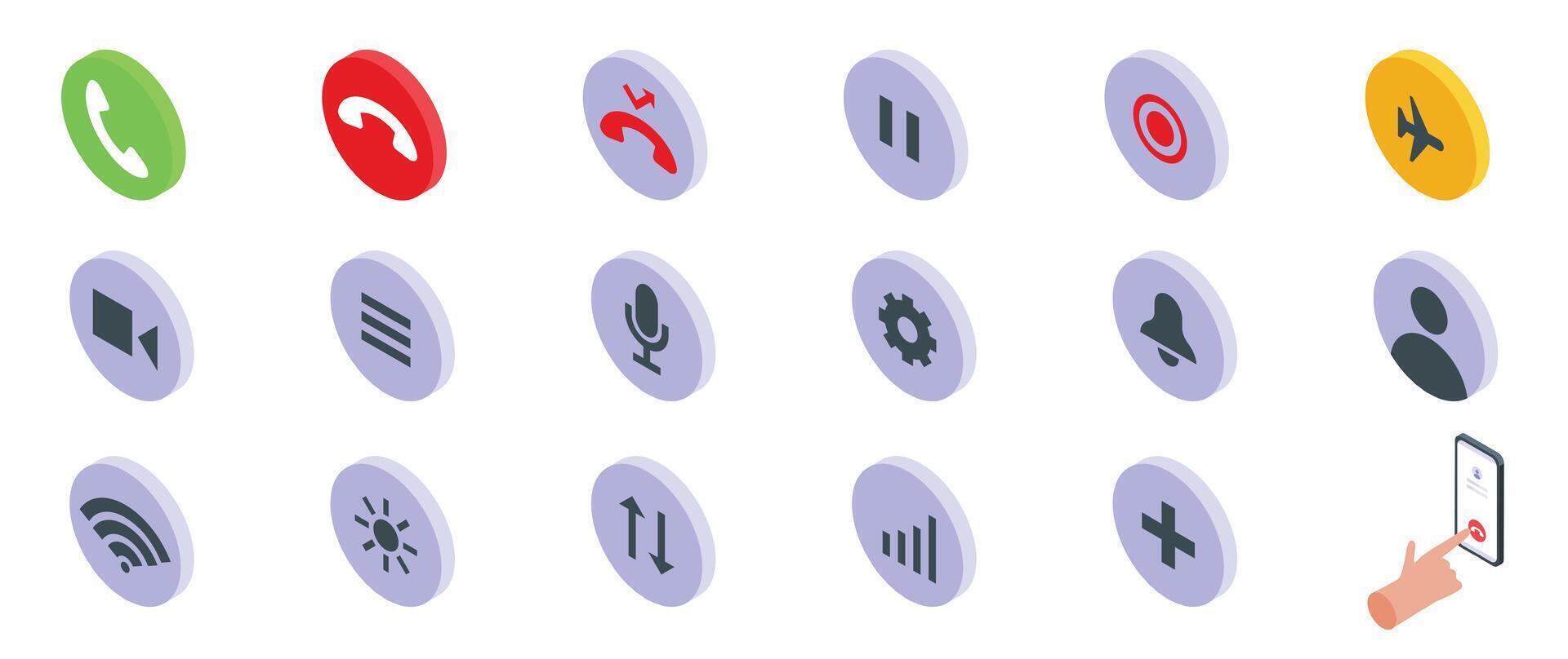 End call icons set. Hand using smartphone app with buttons set isometric view Pro Vector