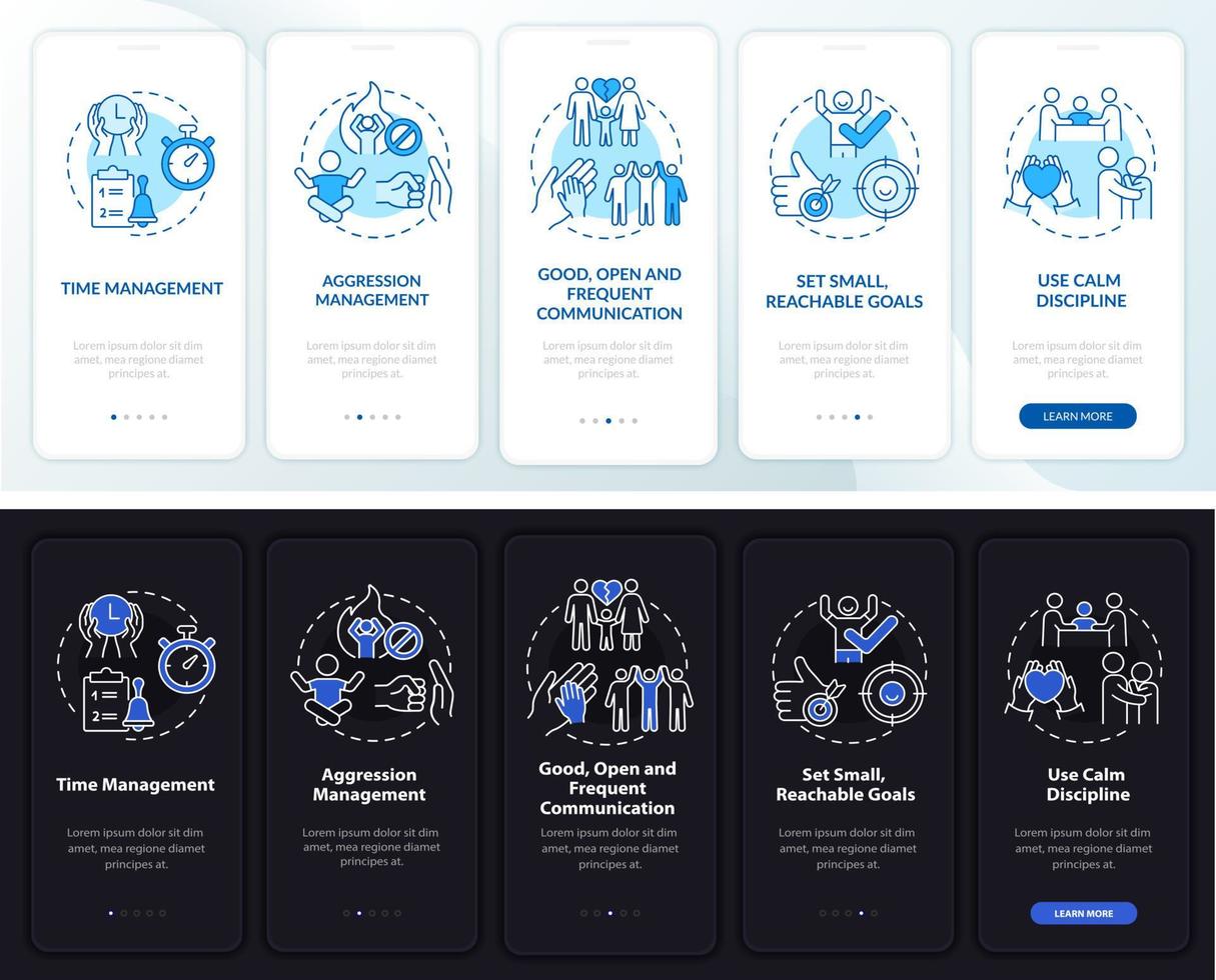 Manage ADHD in kids onboarding mobile app page screen. Emotions control walkthrough 5 steps graphic instructions with concepts. UI, UX, GUI vector template with linear night and day mode illustrations Pro Vector