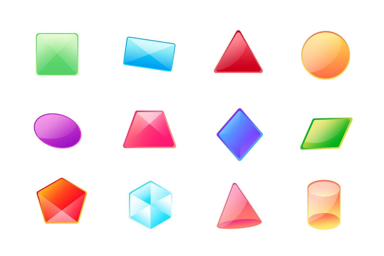 A set of realistic 3D icons of geometric shapes. Circle, square, rhombus, triangle, prism, cone, trapezoid, oval, etc. Suitable for teaching children. Pro Vector