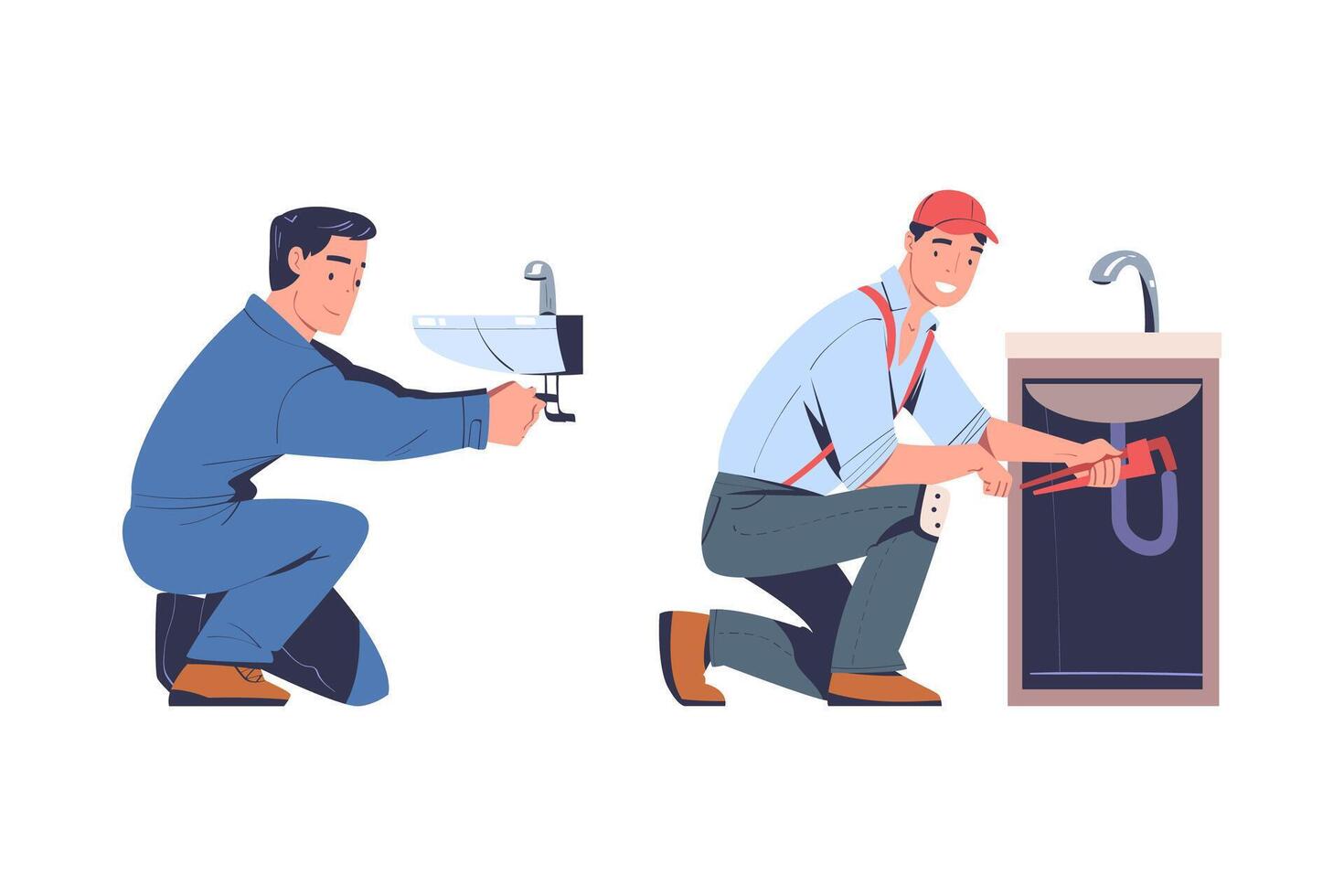 Man Plumber in Uniform with Wrench Fixing Pipe Under Sink Set Pro Vector