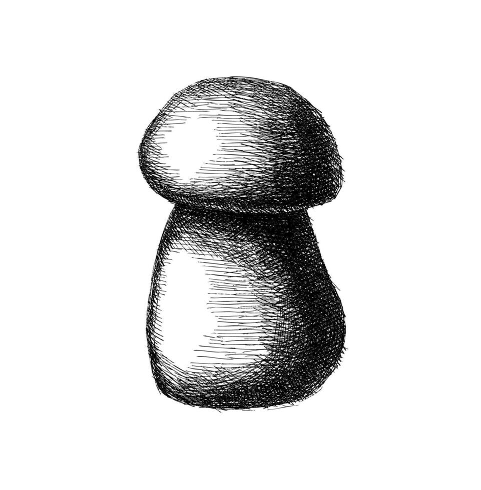 Minimalist black and white ink sketch of a mushroom with cross hatched shading on a plain white background Pro Vector