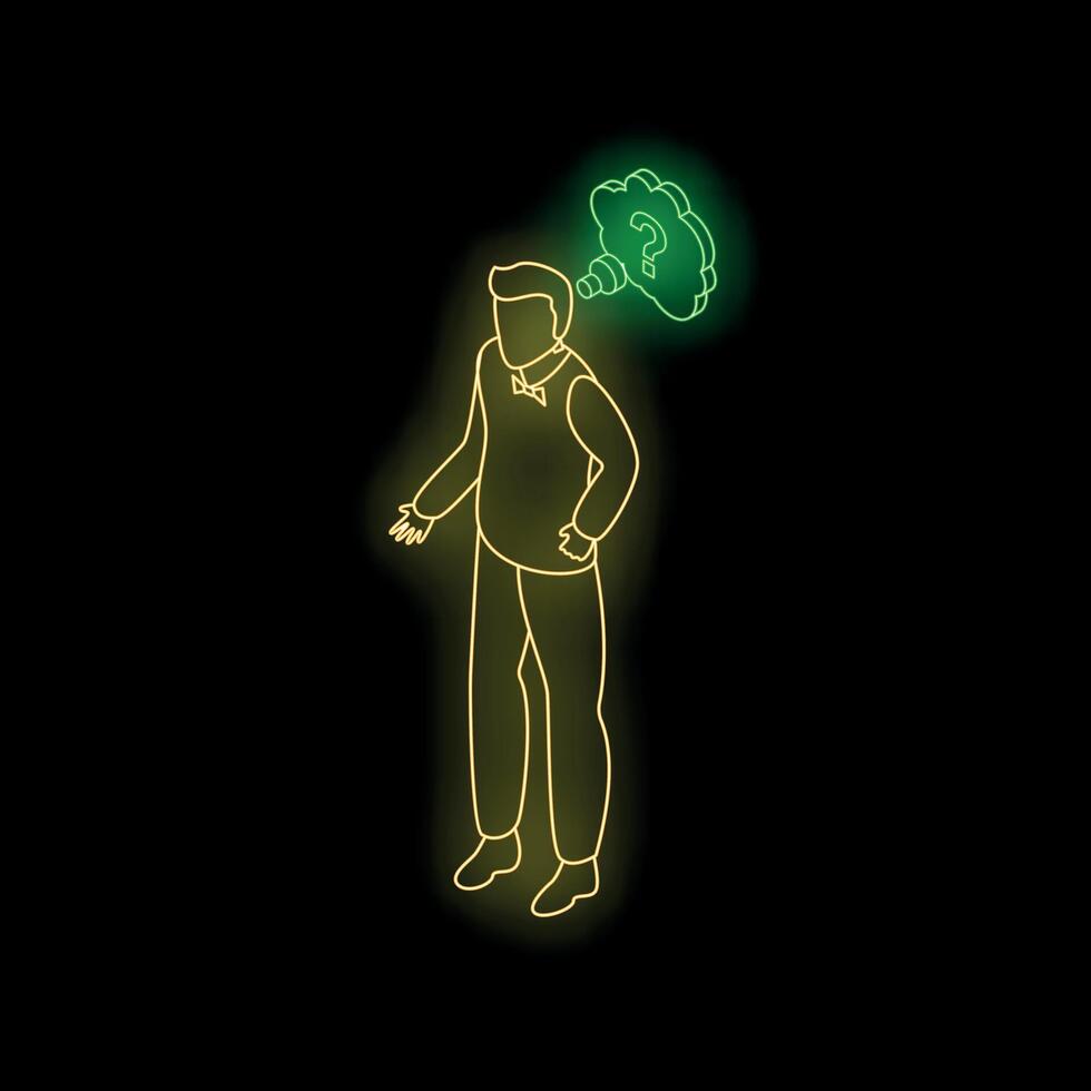 Thoughtful businessman with question mark in neon light style representing problem solving Pro Vector