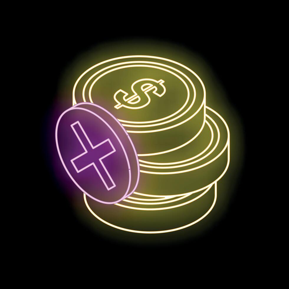 Neon dollar coins adding concept with plus sign on black background Pro Vector
