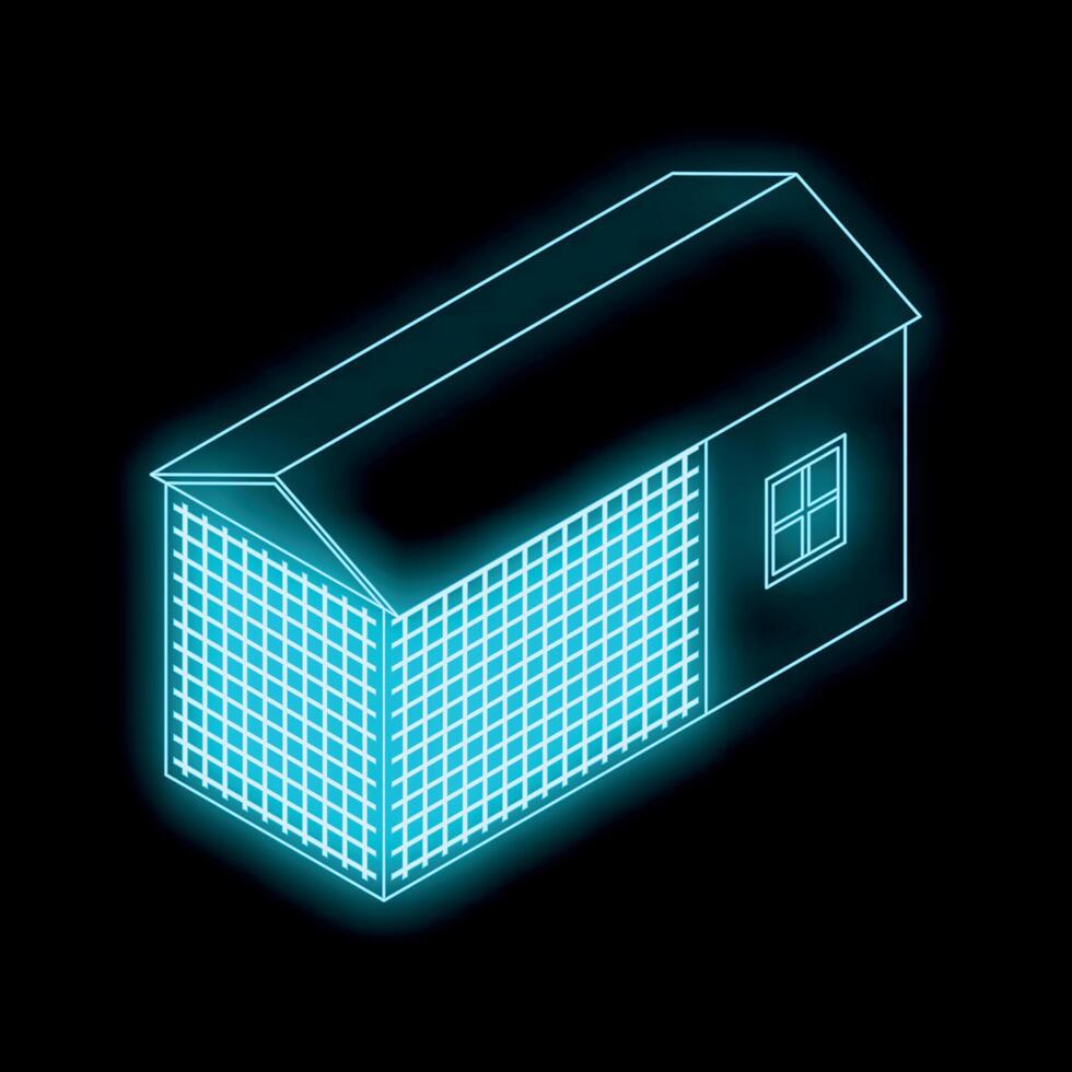Glowing blueprint of a tiny house showing wireframe and solid walls Pro Vector