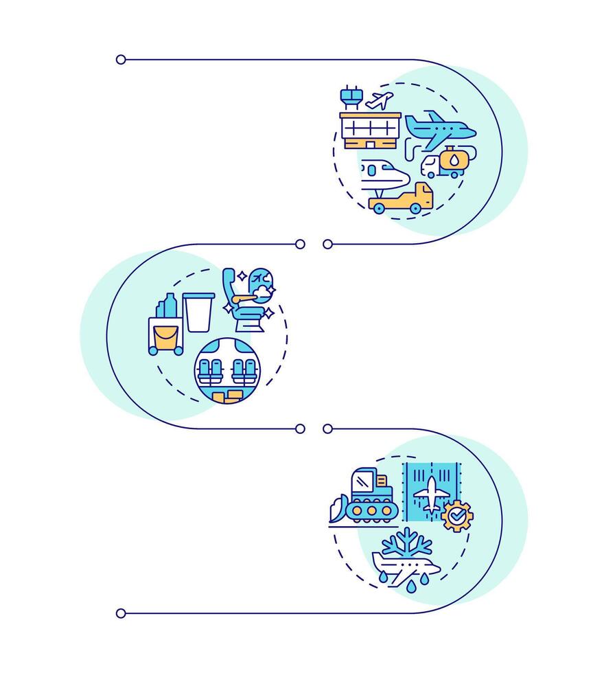 Airplane ground service infographic vertical sequence. Aircraft handling. Cleaning, deicing. Visualization infochart with 3 steps. Circles workflow Pro Vector