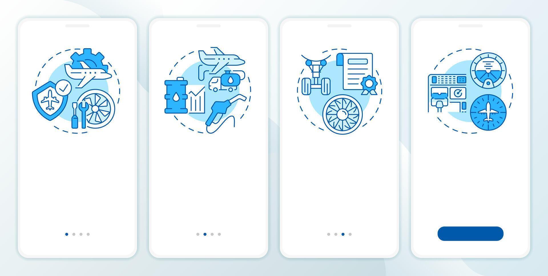 Different aviation services blue onboarding mobile app screen. Walkthrough 4 steps editable graphic instructions with linear concepts. UI, UX, GUI template Pro Vector