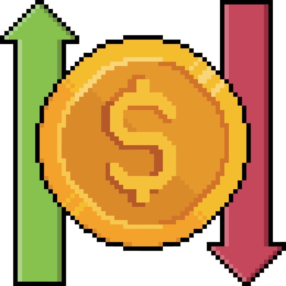 Pixel art of coin surrounded by a green arrow and a red arrow in 8 bit style on white background Pro Vector