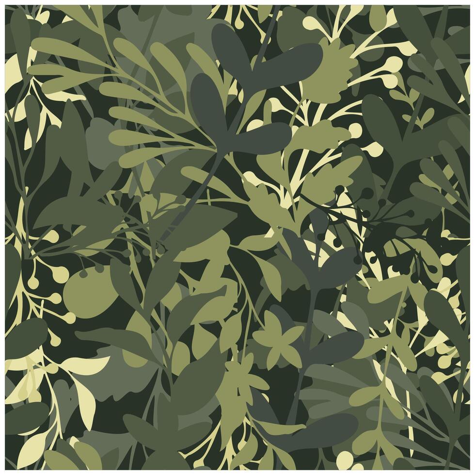 A seamless pattern of stylized leaves and branches in shades of green and yellow. The leaves are arranged in a dense. The background is a dark green. The pattern is abstract and stylized. Pro Vector