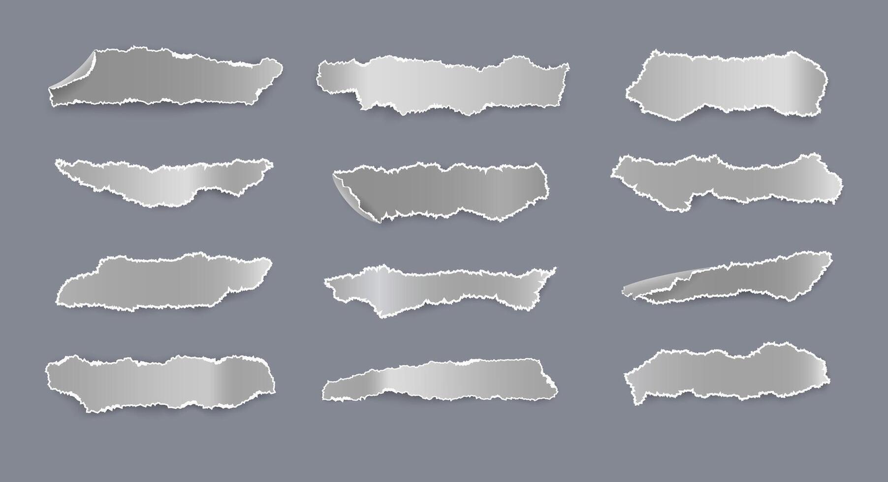 Collection of big set of isolated white torn paper sheets with realistic shadows, design elements of torn realistic paper stripes. Pro Vector