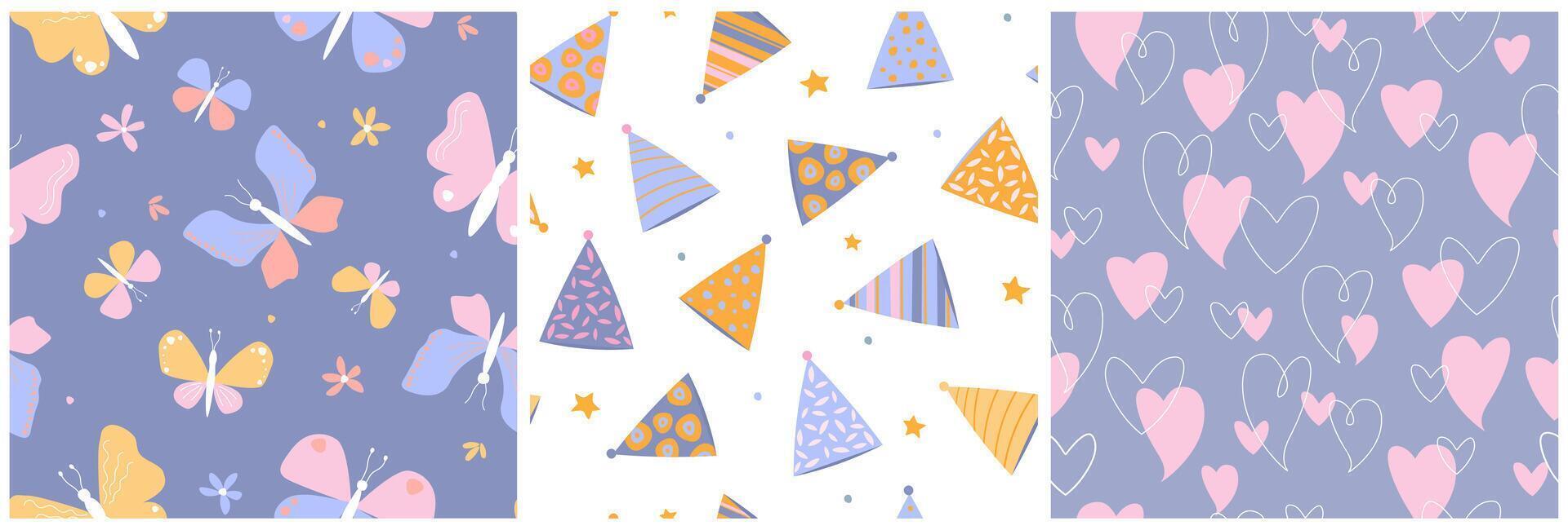 Set of seamless patterns with festive elements, triangular caps, butterflies, hearts. Pro Vector