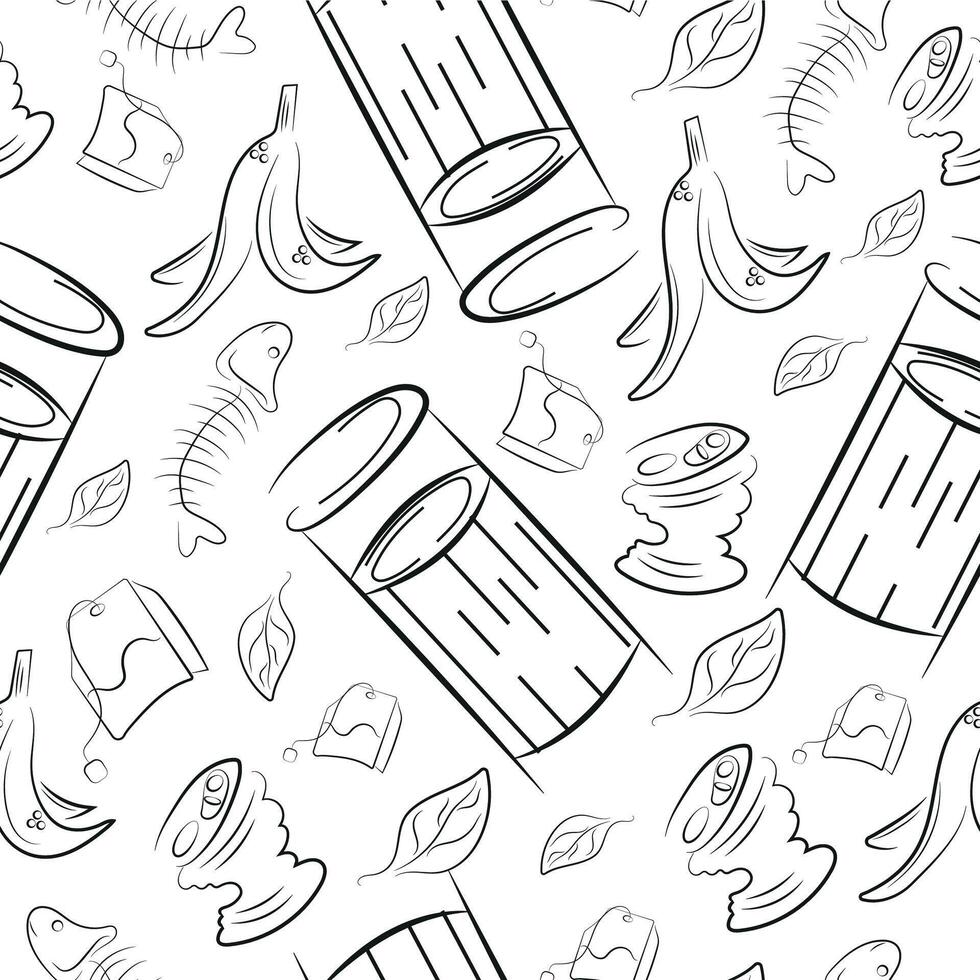 seamless pattern with a small round street trash can and various trash in line art style, to fight against environmental pollution day vector