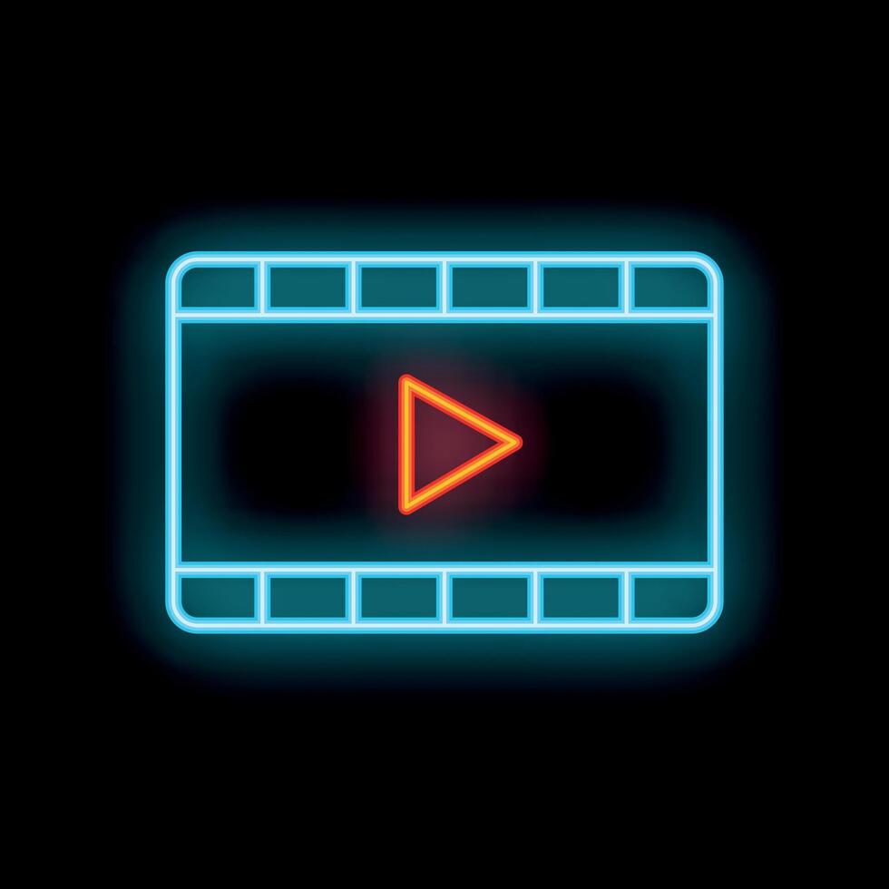 Neon sign of player frame with play button glowing on black background Pro Vector