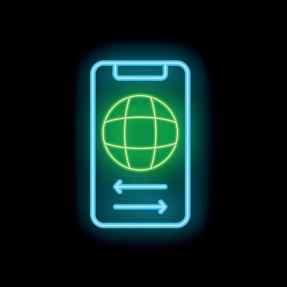 Neon glowing sign of a mobile phone showing the earth globe with two way arrows symbolizing global communication Pro Vector