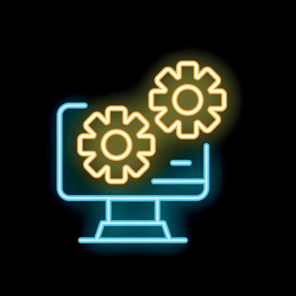 Neon icon of computer displaying two interlocking gears for software development Pro Vector