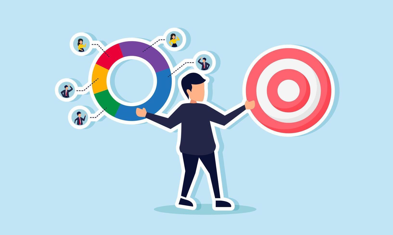 A businessman holds a target board in one hand and a circle chart labeled with people in the other, illustration of managing team task allocation to achieve business targets Pro Vector