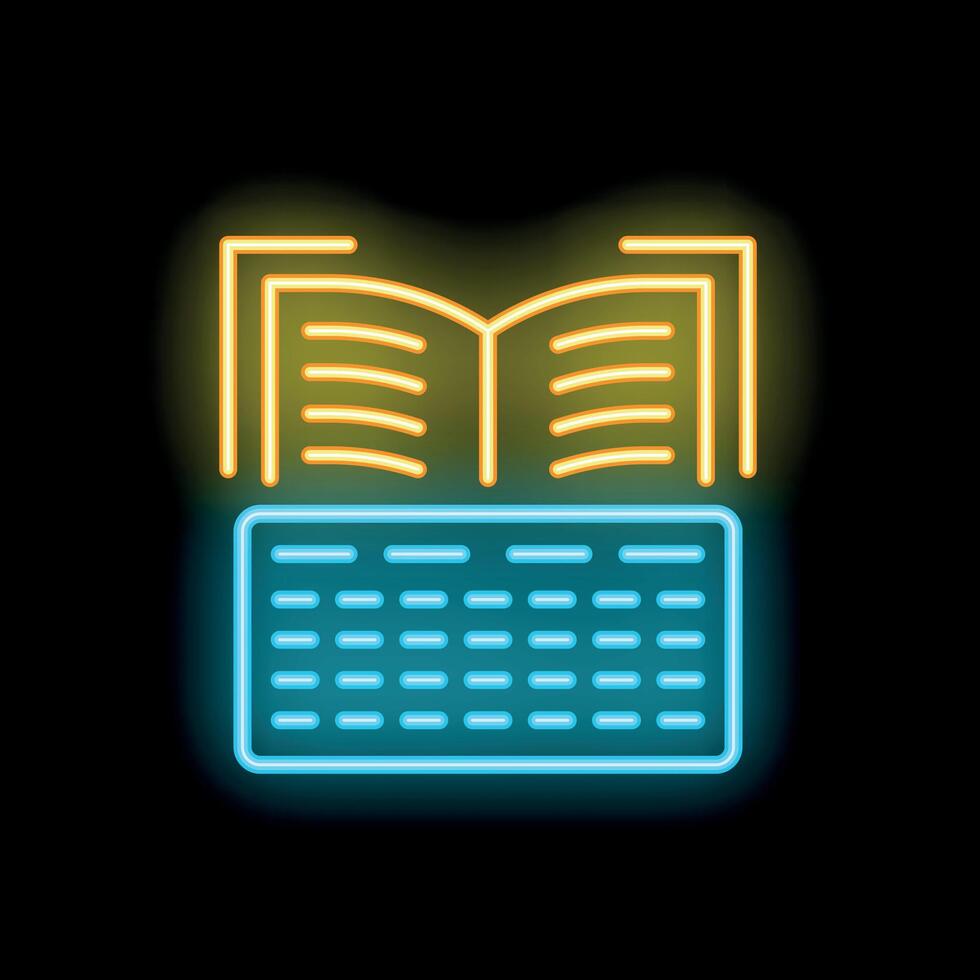 Neon icon of open book hovering over computer keyboard representing online education Pro Vector